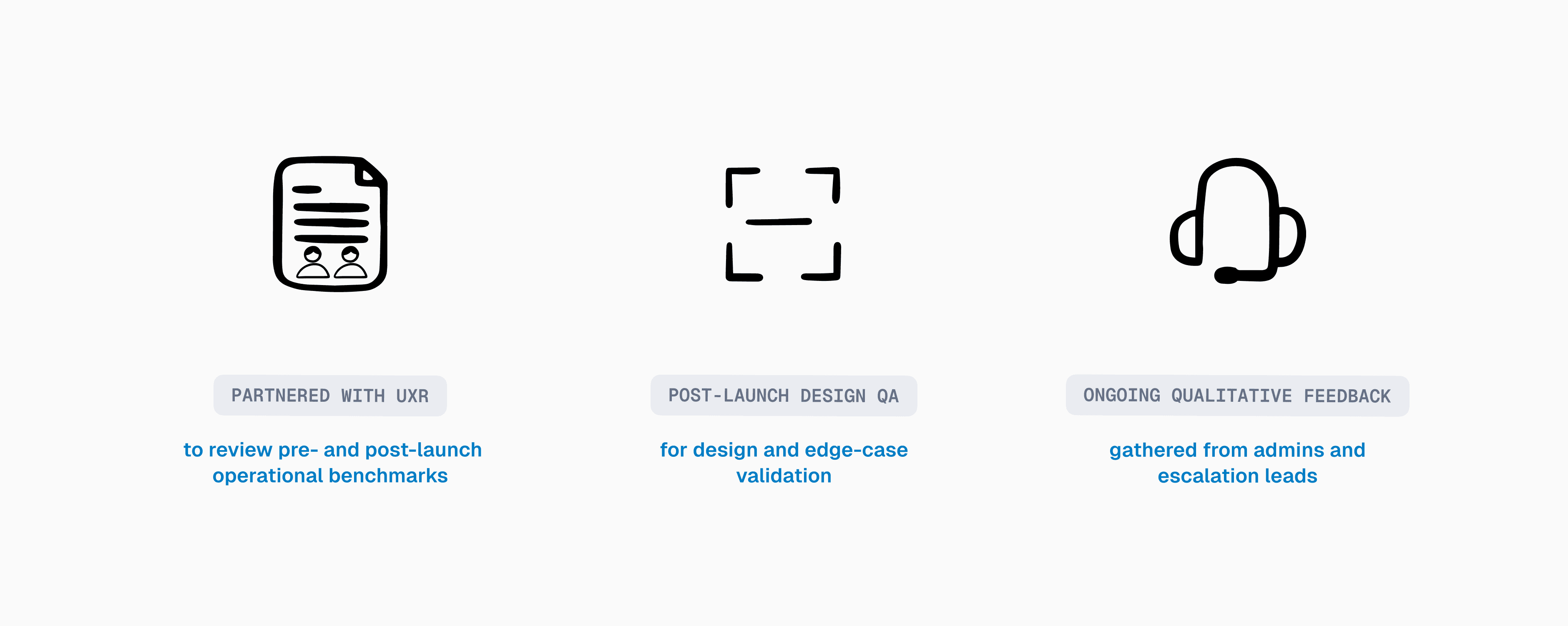 To ensure the system performed under real operational conditions, we partnered with the in-house UX Research team to evaluate impact and validate outcomes after launch.