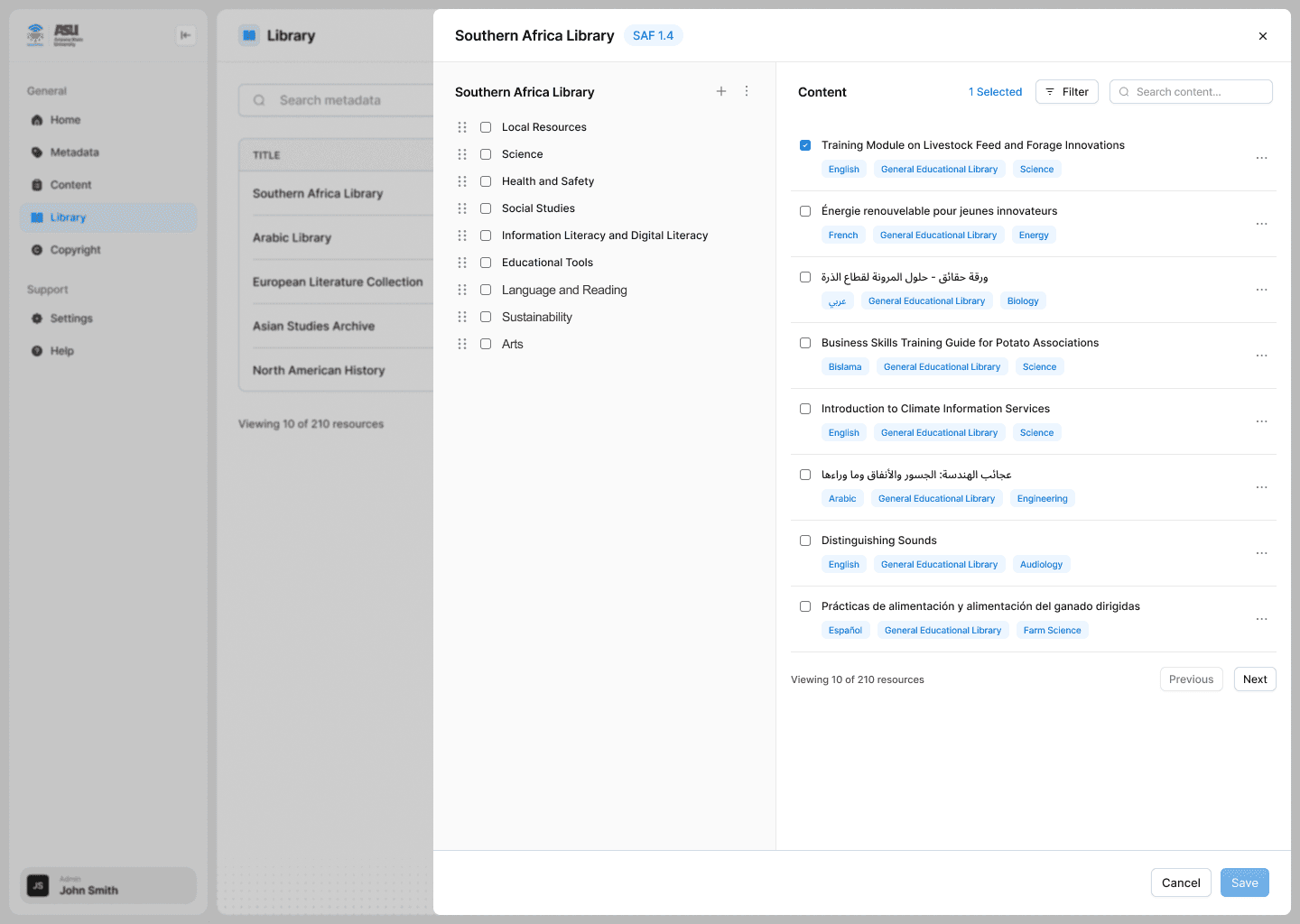 Library organization was handled through a dedicated modal, allowing selected content to be reassigned in a single step.